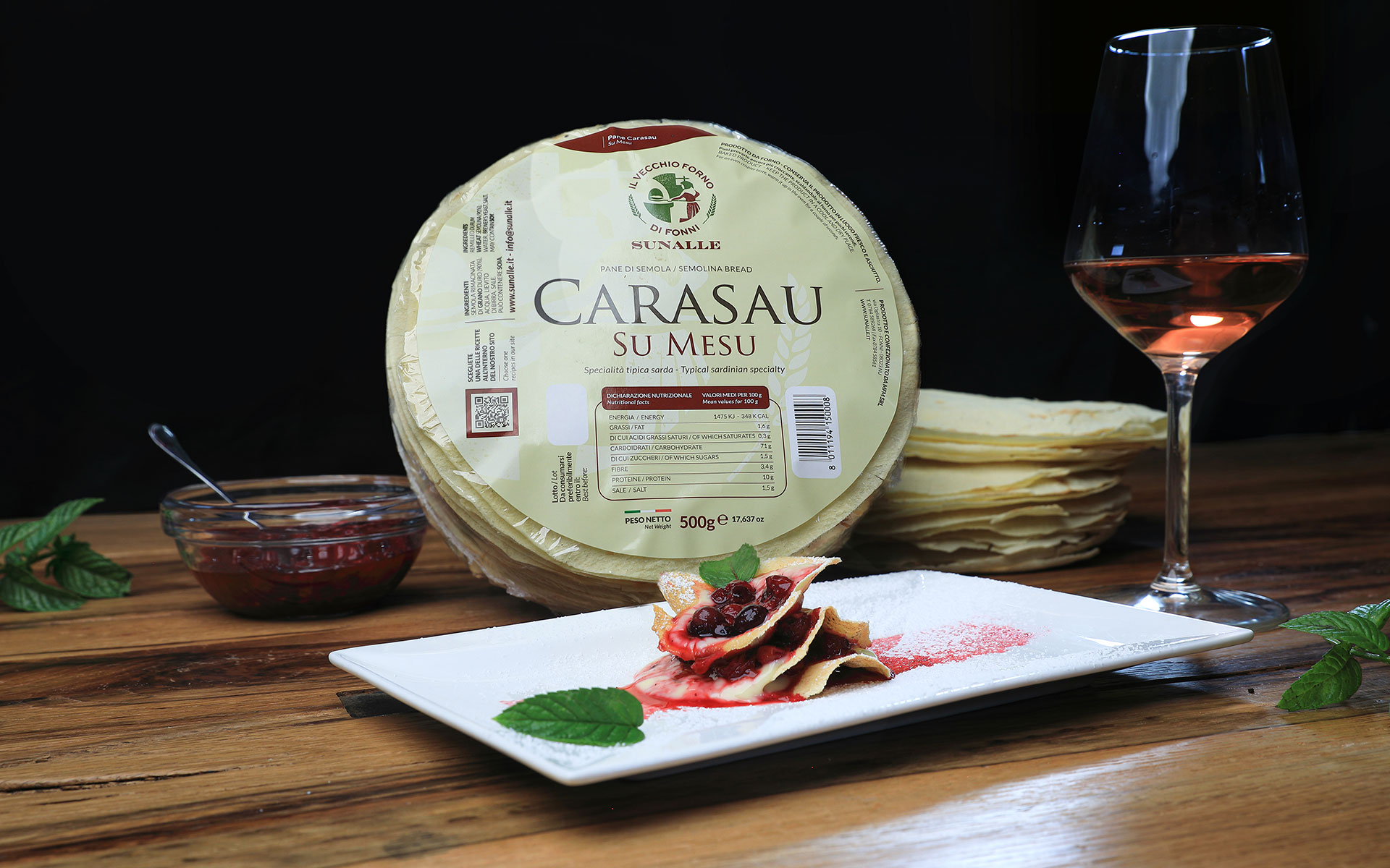 Créer le millefeuille en alternant le Pane Carasau, les fruits des bois et une cuillère de crème anglaise...